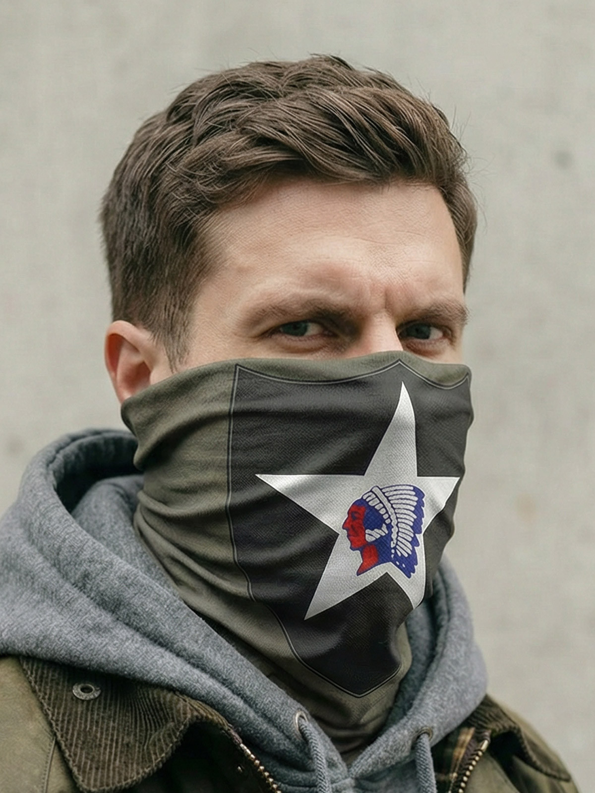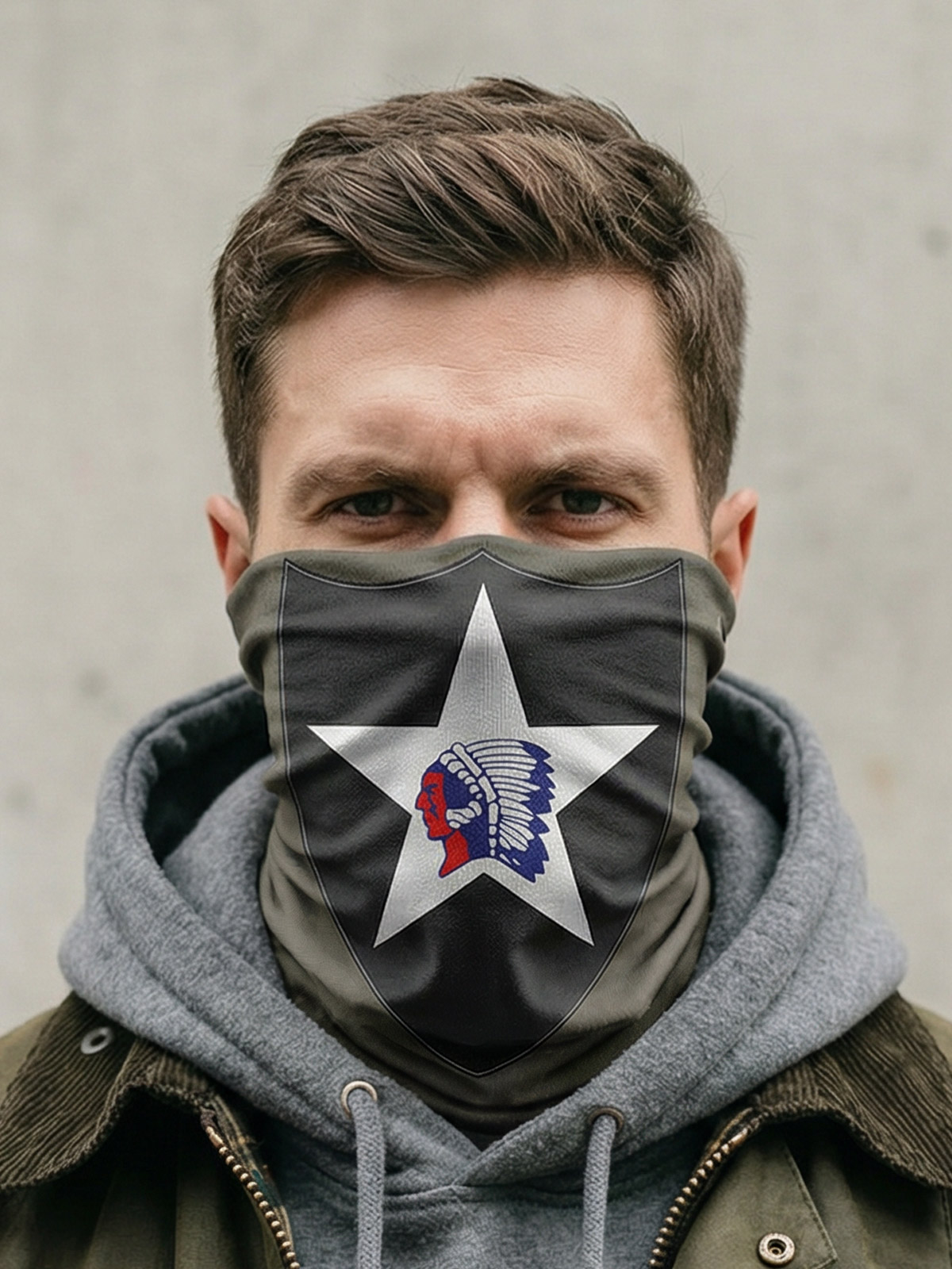 « Mask » ou cache-cou Indianhead (US Second Infantry Division). Doux et ultra respirant / 100% sans couture / 10 façons de porter / repousse l’humidité / SPF40 / résistant aux taches / contrôle des odeurs / protège contre le vent / aide à maintenir l’hydratation / séchage rapide.