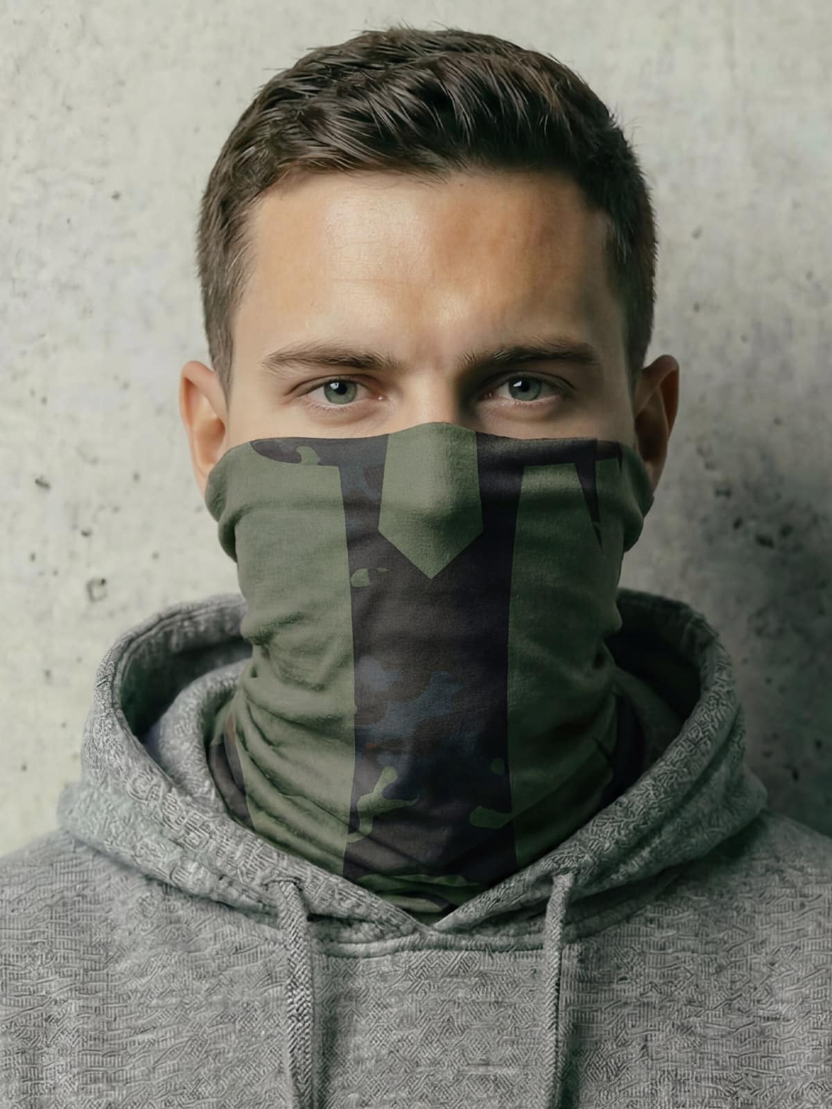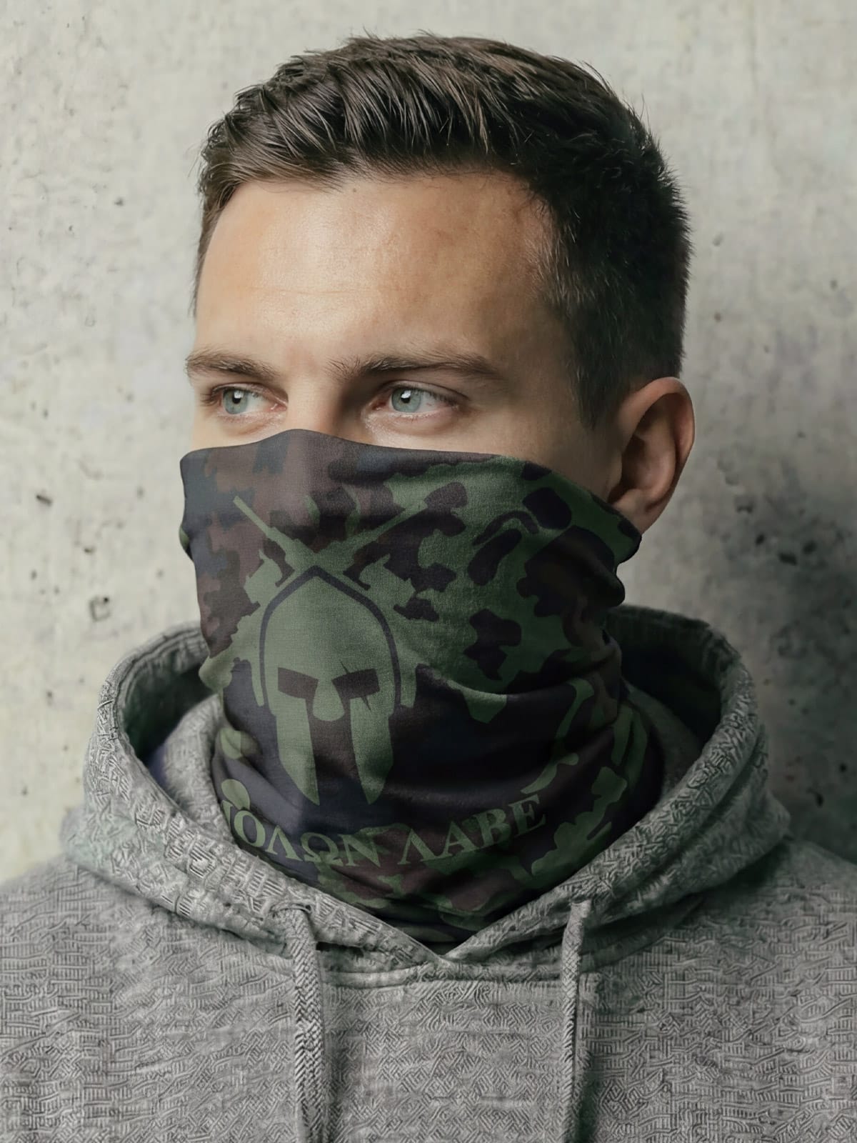 « Mask » ou cache-cou Spartan en camouflage « Partizan » printemps. Recto : casque spartiate. Verso : inscription Molôn labé (Viens les prendre). Doux et ultra respirant / 100% sans couture / 10 façons de porter / repousse l’humidité / SPF40 / résistant aux taches / contrôle des odeurs / protège contre le vent / aide à maintenir l’hydratation / séchage rapide.
